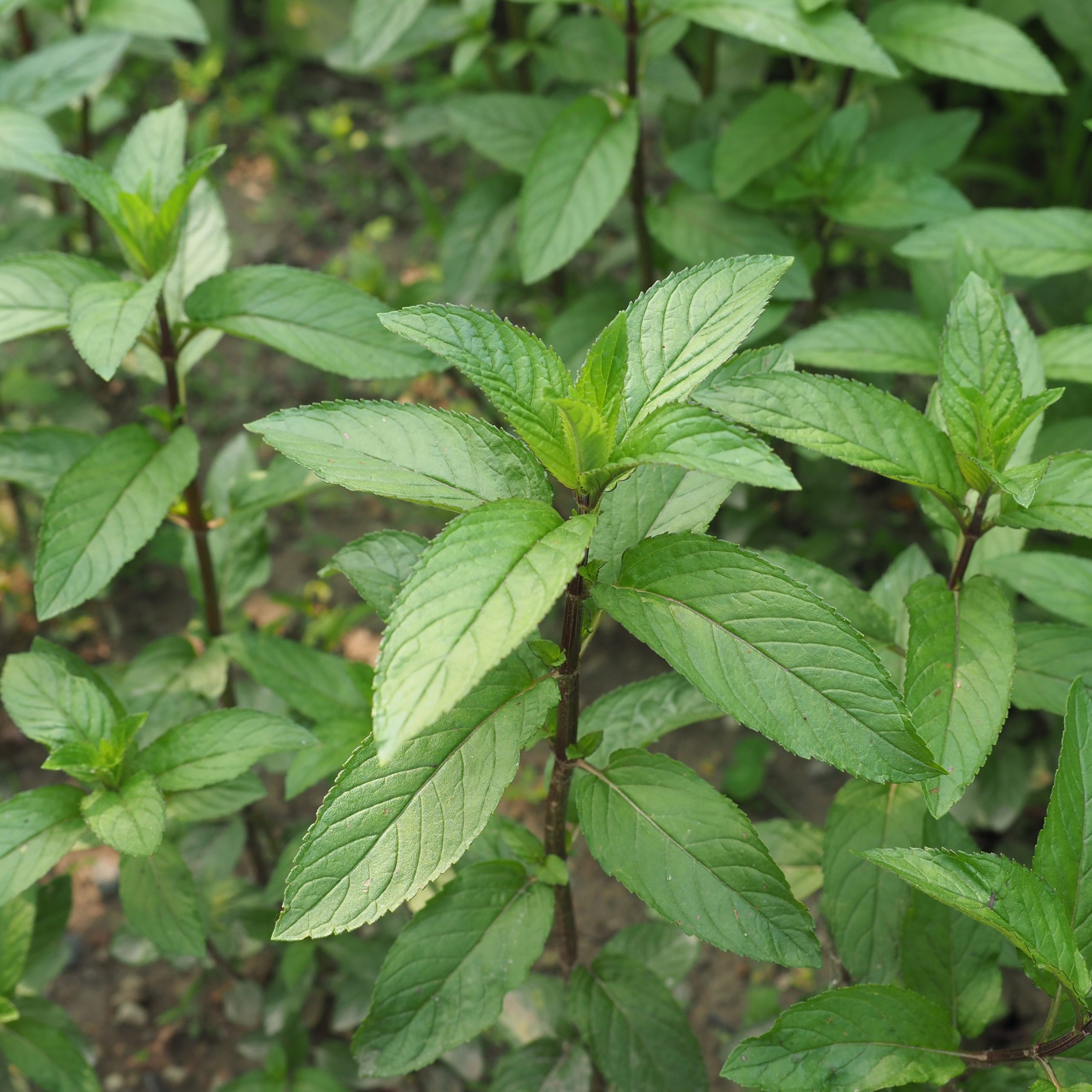 ウォーターミントとスペアミントの交雑種(ハイブリッド)です。非常に繁殖力が強く、地下茎でどんどん広がるため、庭に植える際は注意が必要なほど頑丈です。スペアミントに比べてメントールの含有量が多く、より薬用としての性質が強いのが特徴です。